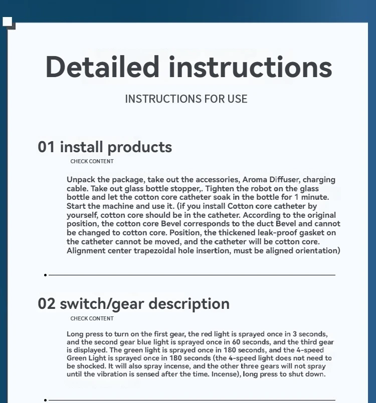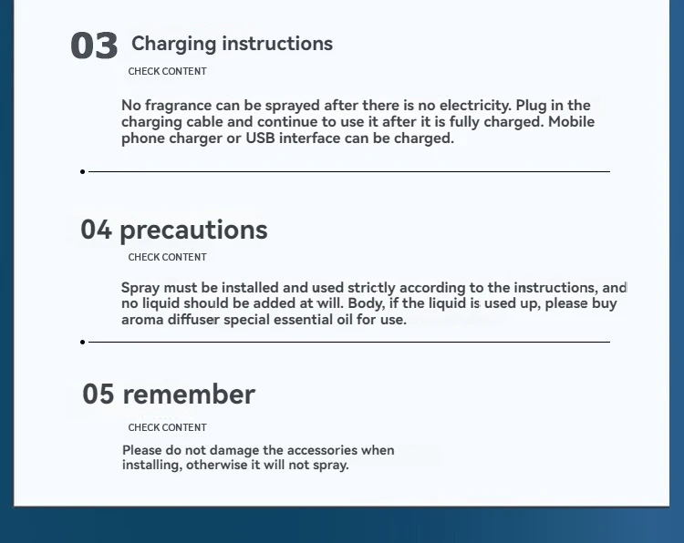 2.3 Adjustable Modes: The smart car air freshener is equipped with ambient lights and provides three spray modes with adjustable spray intervals to meet different fragrance needs. Fresh fragrance mode: green light, spray for 0.2 seconds every 300 seconds. Light fragrance mode: blue light, spray for 0.2 seconds every 90 seconds. Strong fragrance mode: purple light, spray for 0.2 seconds every 10 seconds.